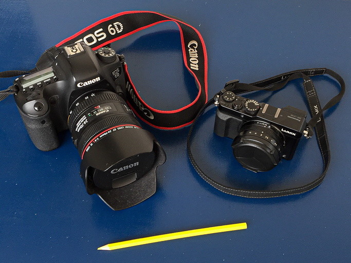 A gauche, le Canon EOS 6D reflex 24x36 avec son objectif 24-70mm f/4, matériel lourd (1,4 kg) et