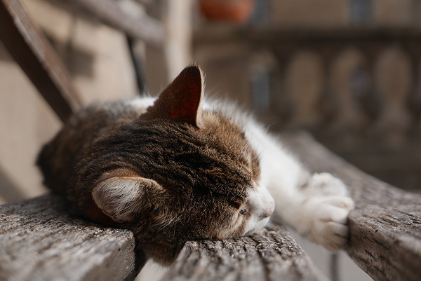 entourer ce chat endormi sur un banc (70mm - f/2.8 - 200 ISO - 1/1300s).